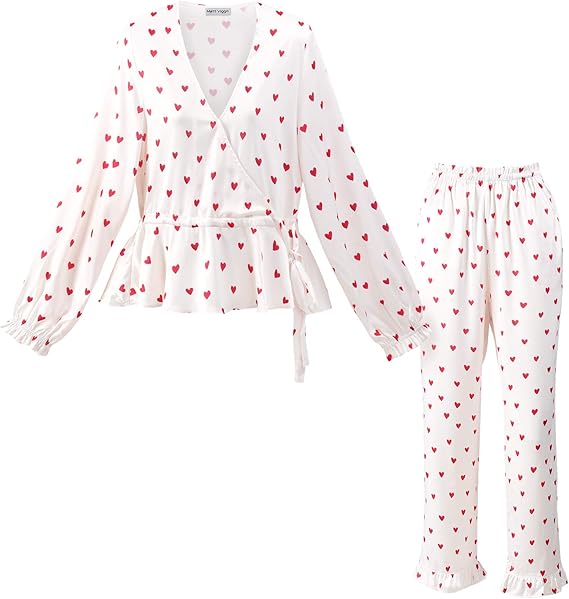 Matt Viggo Ensemble De Pyjama Femme Frill Dentelle Impression Cœur Rouge Nervure Col V Cache Cœur Lacage Ajustable Vetement De Famille Nuit A La Maison Top Et Pantalon Long 38 M Amazon Fr Vetements Et