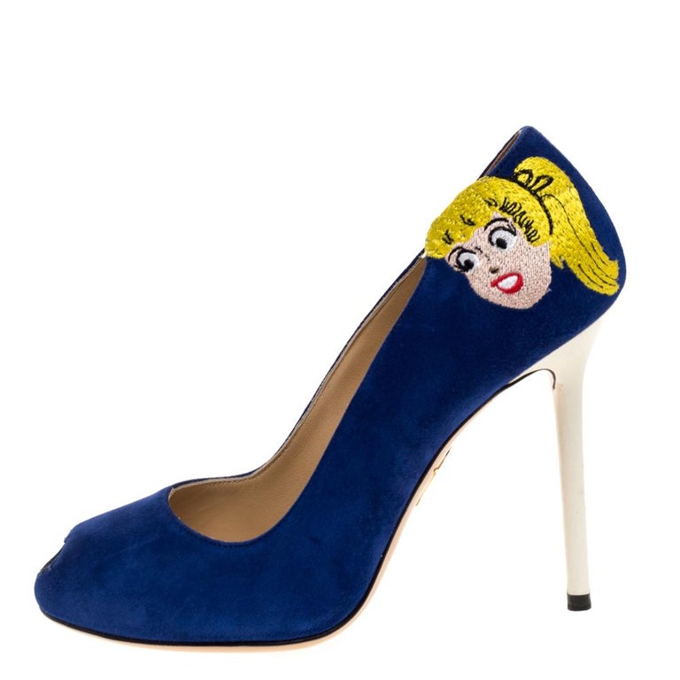Charlotte Olympia Blue Suede Archie Comic Peep Toe Pumps Size 37 For Sale At 1stdibs